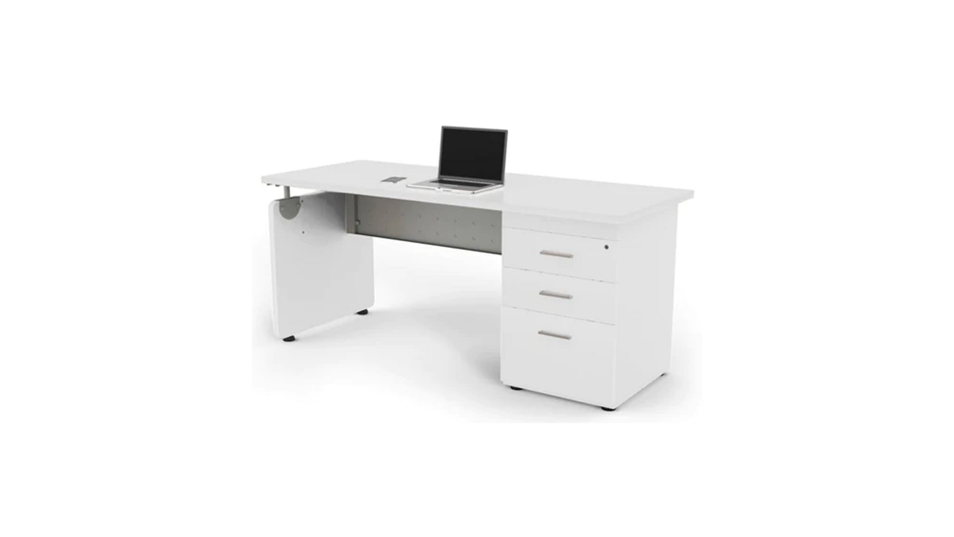 Escritorio fabricado en laminado plástico de 19mm de espesor color de linea a elegir, estructura tubular calibre 20 terminada en pintura epóxica color gris, cuenta con cajonera con 2 cajones papeleros y una gaveta de archivo, primer cajon con cerradura, correderas de extensión total, con regatón nivelador de altura.